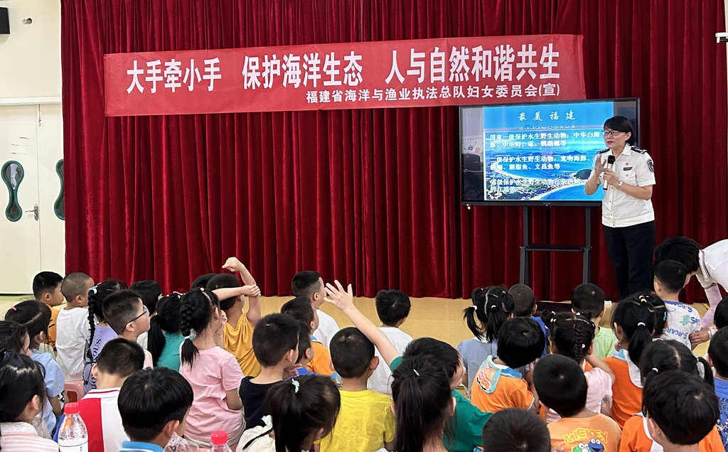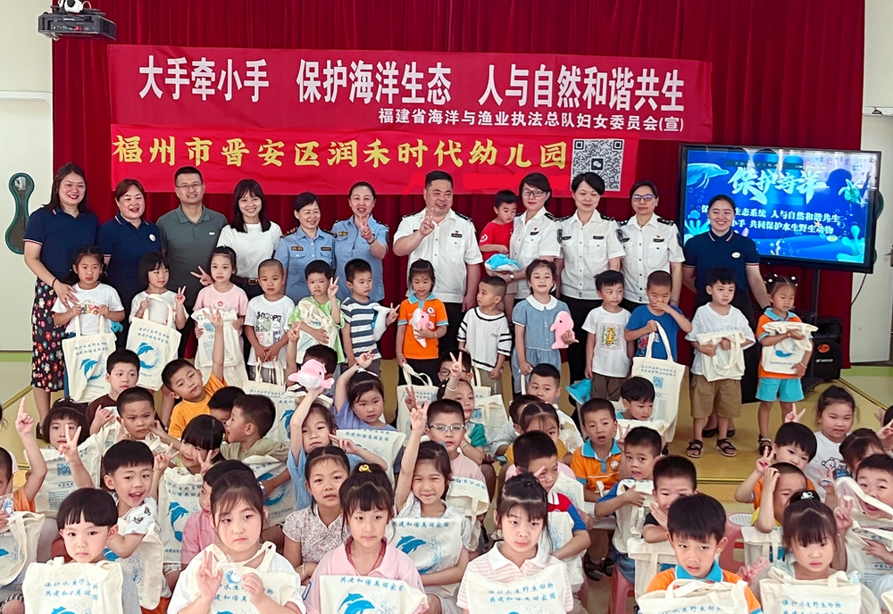 近日,福建省海洋与渔业执法总队妇委会走进福州市晋安区润禾时代幼儿园,开展保护水生野生动物科普宣传活动。总队执法监督处处长戴菊芳用活泼生动、深入浅出的语言给小朋友们上了一堂兼具趣味性与知识性的科普课。