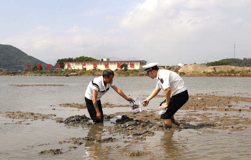执法人员配合抽取养殖蛏贝样品